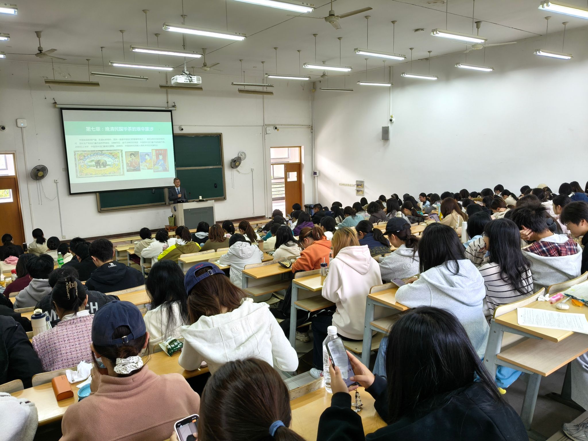 随着茶叶需求激增,英国东印度公司扩大贸易,间接影响中英关系(如鸦片贸易),林则徐虎门销烟到后来鸦片战争,从军阀混战到日本侵华战争,周新华老师对不同时期茶产业现状作了介绍,并在课程中有机融入课程思政,如讲到虎门禁烟时,对林则徐的名言:“苟利国家生死以,岂因祸福避趋之。”作了解析,对“当代茶圣”吴觉农为发展中国茶叶事业作出的贡献作了介绍。