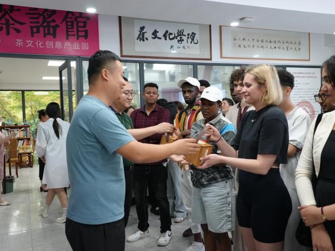 William威廉官方国际教育学院副院长李曦、williamhill官网副院长张帅共同致活动开幕词:茶作为世界三大饮品之一,它从中国出发,穿越历史,跨越国界,连接东西,丰富了人们的生活,茶承载的深厚文化内涵,早已超出了原本的物质范畴,从古代丝绸之路、茶马古道、茶船古道,到今天丝绸之路经济带、21世纪海上丝绸之路等,茶已经成为中国与世界人民相交相知、中华文明与世界文明交流互鉴的重要媒介,成为人类文明共同的财富,不断促进着世界文明和平向好发展。大家在国际茶日这天同饮一杯茶,就是与我们结下了“茶亲”,不管日后身处何方,我们之间都将有以茶为媒介的精神羁绊。并向国际教育学院师生赠送茶礼,希望师生们常饮茶、饮中国茶。