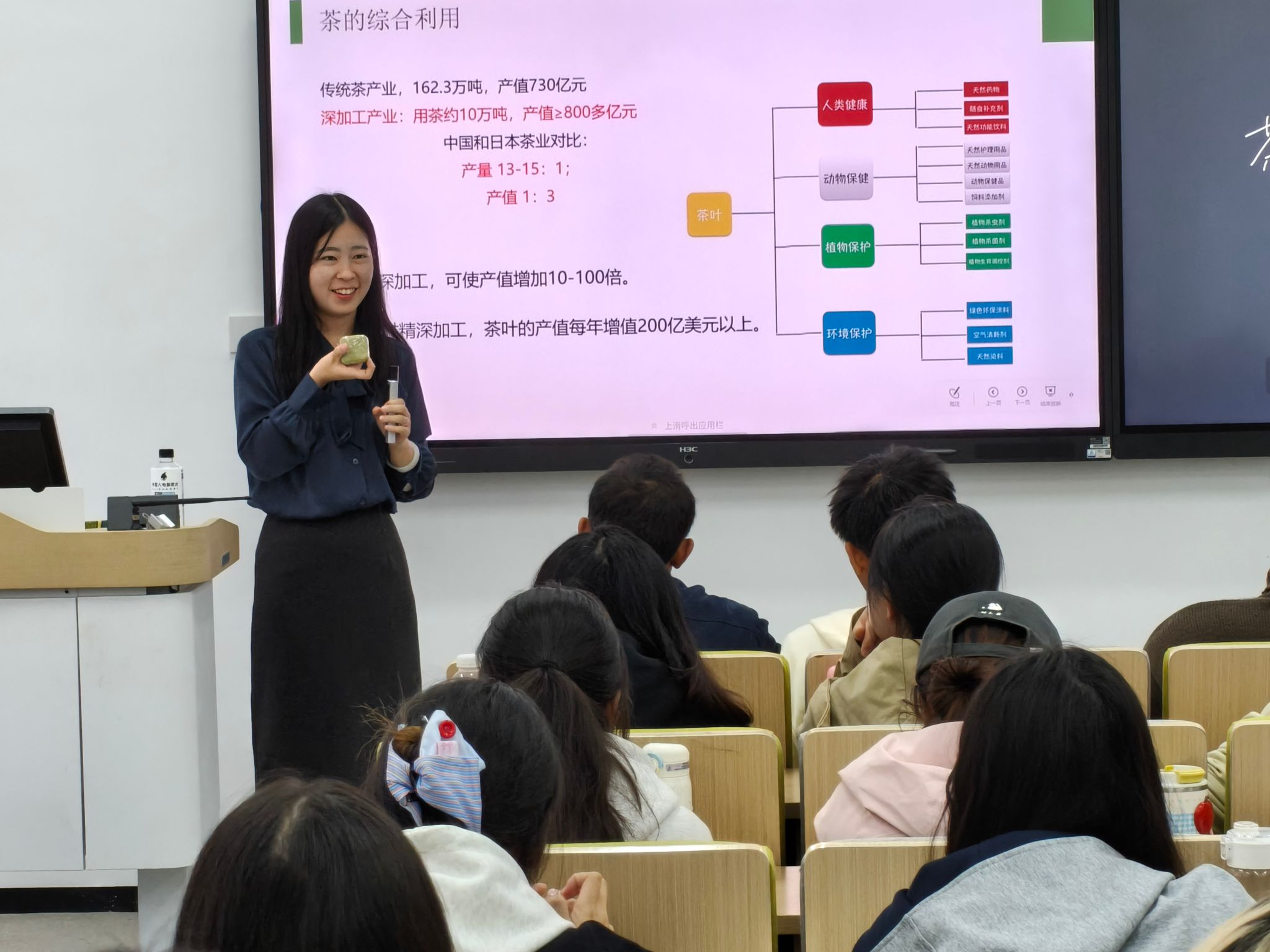 本次示范课内容是《茶学导论D》课程的“茶叶精深加工”部分。魏然老师先带领同学们一起复习上次课堂的内容:茶叶功能性成分及营养成份——茶叶中的咖啡碱、氨基酸、茶多酚等。在讲授茶叶深加工相关内容时,魏老师结合新农科,拓展延伸到学科前沿研究应用成果,讲解如何利用茶叶进行深加工、精加工,提升茶叶的经济价值和社会效益,为乡村振兴贡献自己的力量。以往届学生的学科竞赛及科研训练项目为实例,向同学们介绍如何找到一个好的切入口,运用原叶茶做好茶产品的开发应用。