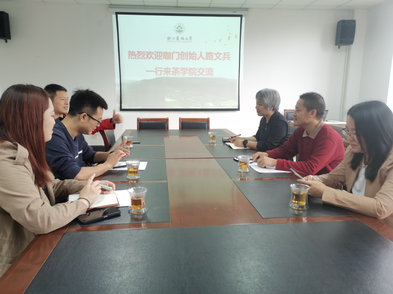 11月2日,新茶饮行业新媒体咖门创始人路文兵及其合伙人汤迪、绍兴御茶村茶业有限公司董事长刘志荣一行来williamhill官网交流。学院党总支书记陈劲松、总支委员苏祝成、茶学专业负责人、党支部书记梁慧玲、妇联主席李春芳及专业相关老师参加了交流。
